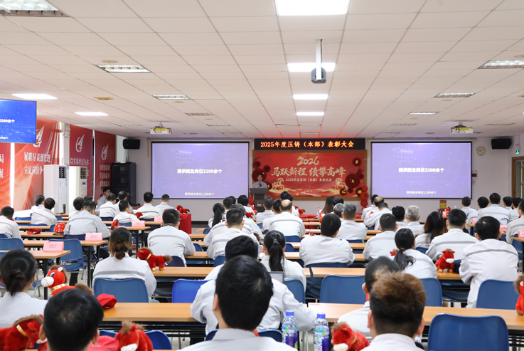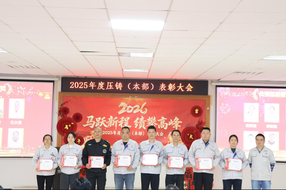 我司副总裁、压铸(本部)总经理莫建忠在总结致辞中首先向受到表彰的个人与团队表示热烈祝贺,并向所有坚守岗位、辛勤付出的员工致以衷心感谢。他充分肯定了过去一年压铸板块在抢订单、保交付、提质增效、降本挖潜等方面取得的扎实成效,同时也深刻剖析了当前存在的短板与不足。面向2026年,莫建忠提出四点期望与要求:一是希望全体员工扛起责任担当,守岗尽责不推诿。坚守自己的“责任岗”,主动担当,做到不缺位、不回避、更不能躺平;二是鼓励大家在工作中多钻研、多创新,巧用“金点子”为公司节约成本、提高效率、改善质量,成为创新的实践者,用智慧为公司创造更大的效益;三是强调落地执行的重要性,做到“马上就办,办就办好”,要雷厉风行,一抓到底,只有落实到行动上才能出成绩;四是倡导全体人员团结一心、凝聚合力,面对困难和挑战,心往一处想、劲往一处使,紧密配合,协同作战,形成强大的战斗力,共同攻克前进道路上的一切难关。